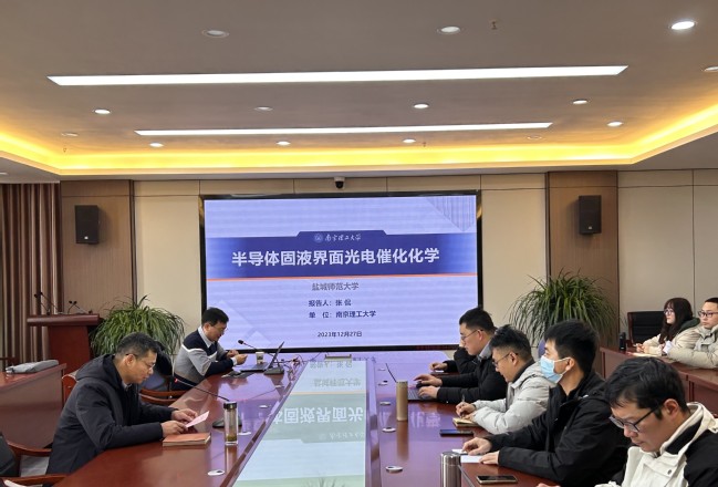 12月29日下午,南京理工大学材料学院张侃教授应邀来我院作题为“半导体固液界面光电催化化学”的学术报告。报告会由副院长黄兵主持,学院部分教师和研究生参加了报告会。