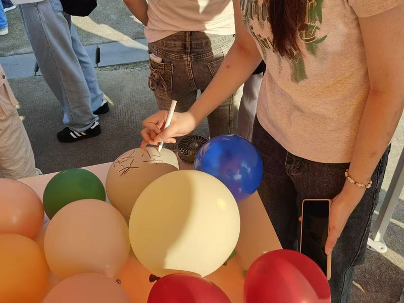 最具“解压感”的当属“扎‘爆’坏心情——赶走烦恼”环节。同学们在气球上写下“考试焦虑”“人际困扰”“自我怀疑”等烦恼,深吸一口气后,果断用尖针将气球扎破——“砰”的声响里,烦恼仿佛随气球碎片一同消散。不少同学连扎多个气球,脸上逐渐漾起轻松笑容,以趣味方式完成了一场与负面情绪的“告别仪式”。