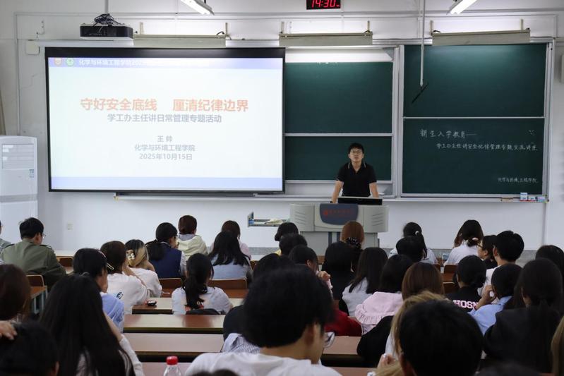 为增强新生安全防范意识,提高自我保护能力,顺利适应大学生活,10月15日,环境与化学工程学院于生化教学楼316教室举办“守好安全底线,厘清纪律边界”学工办主任讲日常专题讲座。学院学工办王帅老师主讲,2025级全体新生300余人参加。