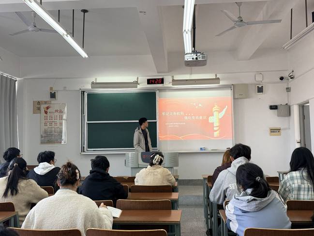 分团委副书记乐达援引刘少奇同志《论党》,着重强调党员自觉性的核心——党员学习的根本出发点是为人民事业奋斗,绝无任何功利目的。他指出,清晰界定并深刻把握党员义务与权利,是锤炼党员素质、提升党员队伍建设质量的关键,是规范党内政治生活、涵养良好政治生态的保障,是确保党的路线方针政策及决策部署落地的必然要求,更是党员践行合格标准、永葆先进本色的基础。其次,他阐明正确行使党员权利首在明确根本目的,党员须以对党的事业高度负责的态度,坚持实事求是、恪守岗位职责,依规依纪依法行权。乐达强调党员权利与义务辩证统一、相辅相成:履行义务是行使权利的前提,切实尽责才能更好享有权利;行使权利是履行义务的保障,合法行权可有效推动义务落地。