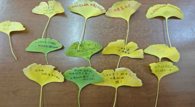 “叶签载情,拾秋悦己 ”环节充满自然意趣 。参与者在校园指定区域捡拾形态各异的落叶与枯枝,随后借助旧卡片 、胶水 、马克笔等辅助材料,根据叶片的颜色与纹理搭配对应情绪,将其固定在卡片上做成独特的书签基底。大家在书签背面书写简短有力的情绪调节短句,创作过程中还相互协助调整素材摆放位置,在指尖翻飞间将秋日韵味与心灵感悟融为—体,让情绪调节自然融入日常学习标记场景。