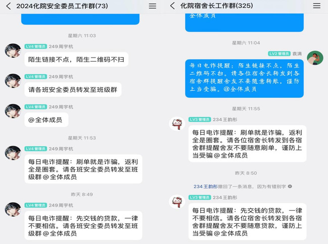 线上宣传同步发力,学院建立常态化提醒机制,每日在宿舍长群、安全委员群、楼层长群等精准推送反诈预警信息、典型案例与防范提示,实现反诈宣传无死角、全覆盖。通过层层传导、全员覆盖的宣传模式,将反诈知识传递到每一间宿舍、每一位同学,营造“人人懂反诈、时时防诈骗”的良好氛围。